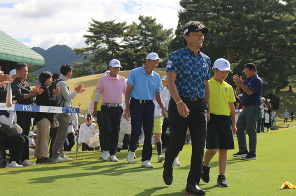大会最終日の10月26日に、トーナメント開催地の福岡カンツリー倶楽部和白コースにて開催。ゴルフに興味がある、これからゴルフを始めたい、ゴルフがどんなスポーツか知りたいという小学生向けの体験教室。実際のゴルフクラブでスイングやショット体験のほか、ゴルフを始めるための心得、エチケット、マナーなどを学んでいただきました。体験教室以外の時間は、実際のシニアプロのプレーを見学してゴルフ競技へのさらなる興味関心を高めていただきました。また、最終の2組にはエスコートキッズとして選手と一緒に登場いただきました。