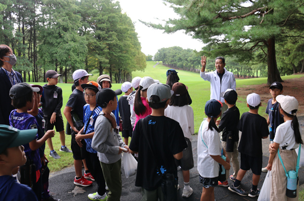 自分たちの住む地域にあるゴルフ場を知ってもらうため、課外授業として福岡カンツリー倶楽部和白コースにご招待しました。シニアプロによる案内で、コースや施設内を見学したあとスナッグゴルフを体験してもらいました。